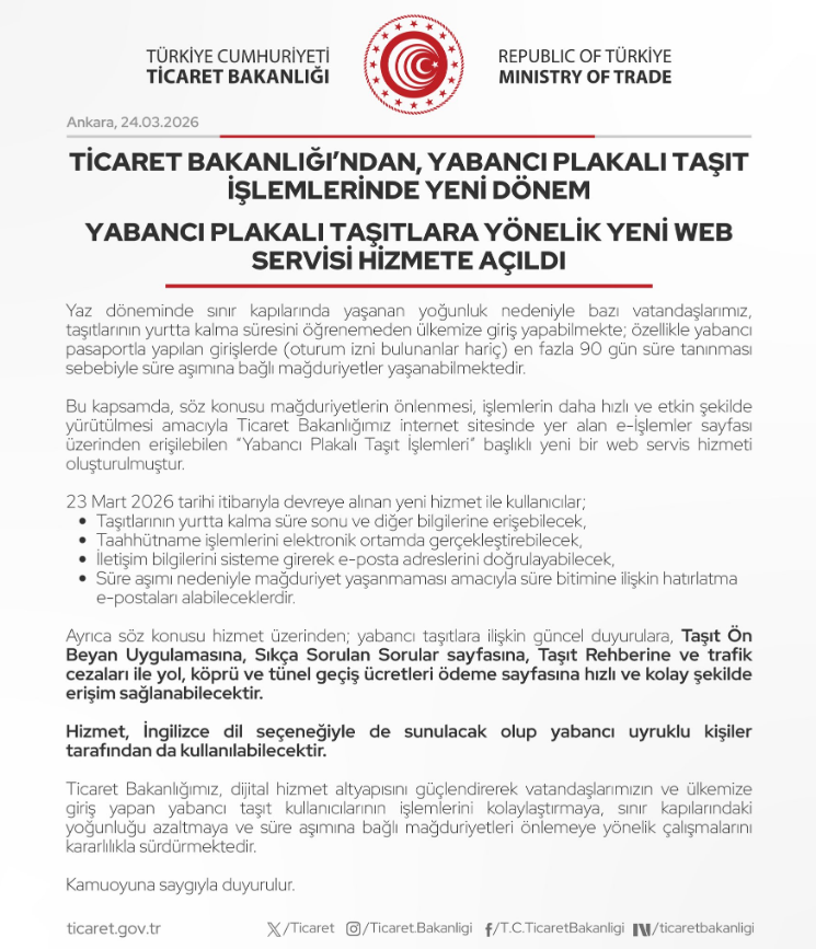 Ticaret Bakanlığı'ndan, yabancı plakalı taşıtlara yönelik yeni web servisi hizmete açılmış olup, sözkonusu hizmete ilişkin duyuruya aşağıdaki dosyadan ulaşılabilir.